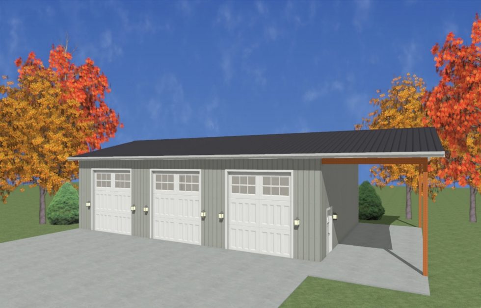 You’ve put it off all Summer, but you still have time to order this 3car garage and receive the building kit within 4 weeks if ordered in the month of September! At 1,536sqft, this oversized garage has tall walls at 14’ and large overhead door openings at 10’x12’. Not only do you now have room for 3 vehicles or toys, but you also have an additional covered area for more items that are okay to be outside with little exposure.